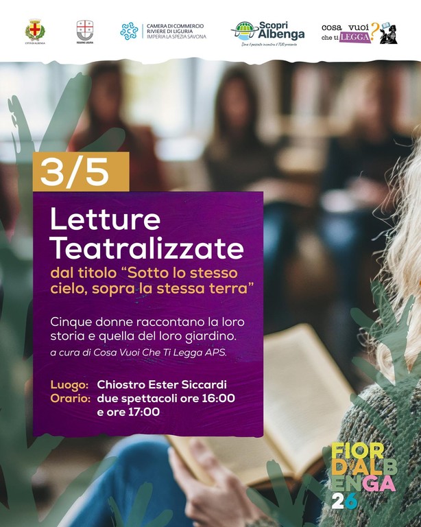• “Sotto lo stesso cielo, sopra la stessa terra” – letture teatralizzate. Ore 16.00 e 17.00 al Chiostro E. Siccardi. Cinque donne raccontano la loro storia e quella del loro giardino, a cura dell'Associazione #cosavuoichetilegga APS