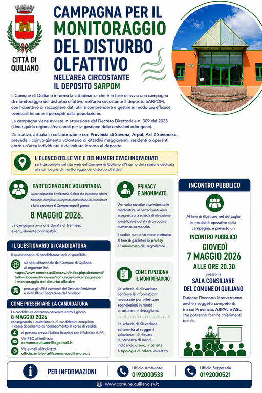 Il Comune di Quiliano informa la cittadinanza che è in fase di avvio una campagna di monitoraggio del disturbo olfattivo nell’area circostante il deposito SARPOM, con l’obiettivo di raccogliere dati utili a comprendere e gestire in modo più efficace eventuali fenomeni percepiti dalla popolazione.