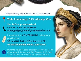 • Visita guidata a pagamento nel Centro storico. Orario 16.30, ritrovo presso lo IAT – Torre Civica. Prenotazioni: turismo@comune.albenga.sv.it – guideliguria@gmail.com