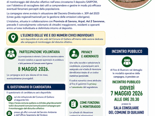 - sul sito istituzionale del Comune di Quiliano, nella sezione dedicata raggiungibile al seguente link: https://www.comune.quiliano.sv.it/index.php/documenti/tutti-i-documenti/comune/comunicazioni/campagna-per-il-monitoraggio-del-disturbo-olfattivo