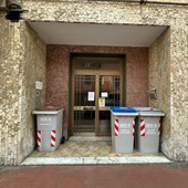 Savona, bidoni condominiali in un portone di Lavagnola. Impossibile raggiungere il citofono